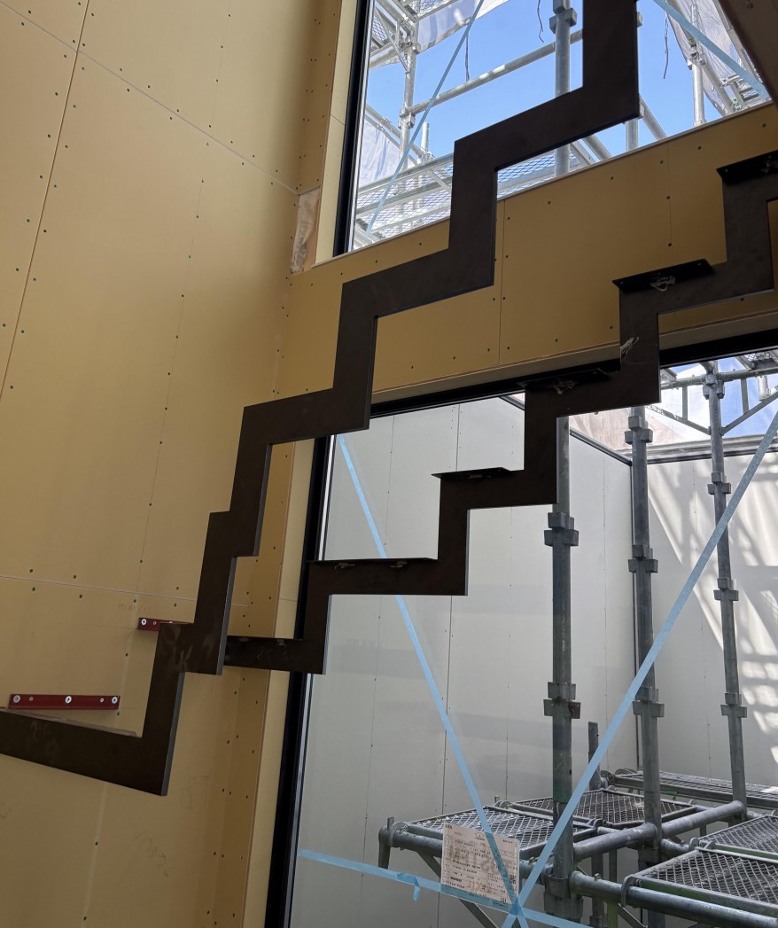 足場があり見えにくいですが、鉄骨階段と階段手すりの写真です。